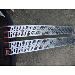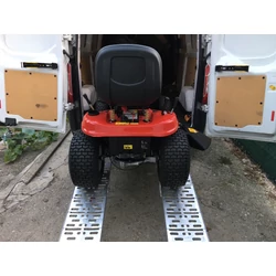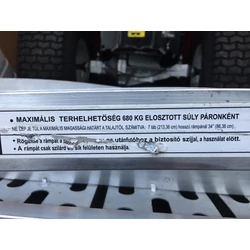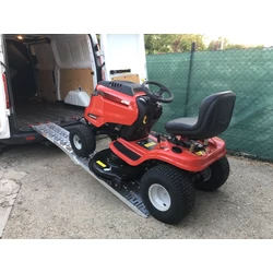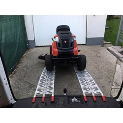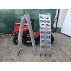 Összecsukható fölhajtó rámpa fűnyíró traktorok szállításához. A rámpa alumíniumból készült ezért nagyon könnyű. Mivel összehajtható, ezért könnyű tárolni és a szállító autóban vagy az utánfutón sem foglal el sok helyet. A teherbírása rámpánként 340 kg. A rámpa teljes hossza nyitott állapotban: 227 cm. Amikor összehajtjuk akkor a hossza mindössze 116 cm. A rámpa szélessége 28 cm, így a legszélesebb fűnyíró trakttor kerék is biztonságosan végig gurul a rámpán a föl és a lehajtásnál. Párban kapható, azaz egy dobozban 2 db rámpa van. |