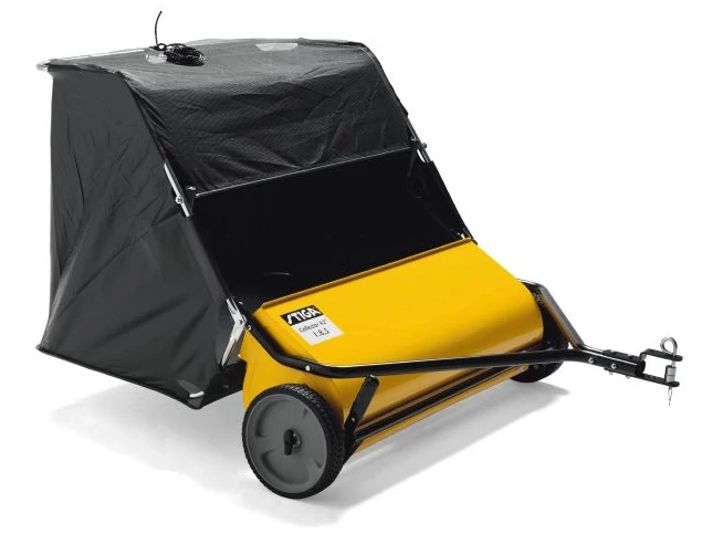 Vontatott seprőgép a levágott fű és a lehullott falevelek összegyűjtésére. A forgókefe végzi a fű és lomb gyűjtőbe seprését.